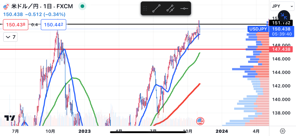 前回高値ラインも超え、政府の為替介入ラインとも言われる151円付近まで上昇したドル円は、非常に強いレジスタンスラインに抑え込まれています。投資家達の上昇期待圧力に強力に下支えされていて、上にも下にも動けない状態です。こんな状態で為替介入だの、マイナス金利解除だの、とびっきりのニュースが出ようもんなら投資家心理全開の下支えが無くなり一気に下落するんじゃね!っていう大衆心理が円高に方向転換させてしまいます。